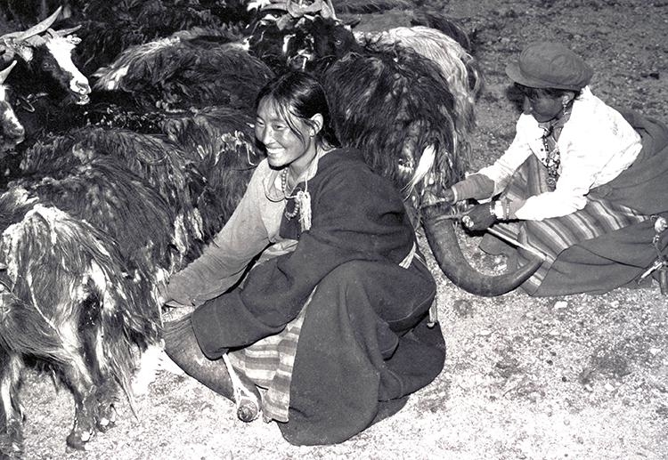 這是在雙湖辦事處北措折鄉(xiāng)(現(xiàn)雙湖縣措折強瑪鄉(xiāng))牧女正在使用牦牛角當(dāng)器皿擠羊奶(唐召明1989年攝)