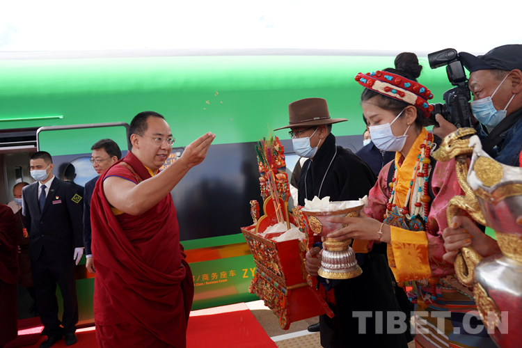 上午10點35分,班禪乘坐的復興號緩緩駛?cè)肴湛t火車站。西藏自治區(qū)人民政府副主席、黨組成員,日喀則市委書記張延清等市委相關領導在火車站迎接,與班禪互敬哈達、互致問候。