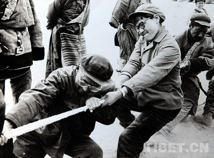 1976年盛夏,雙湖辦事處(現(xiàn)雙湖縣)副書記次仁玉珍(中)在進(jìn)行拔河比賽。這是西藏開發(fā)藏北無人區(qū)后,雙湖辦事處為拓荒者首次舉辦的體育活動(dòng)(唐召明翻拍資料圖片)