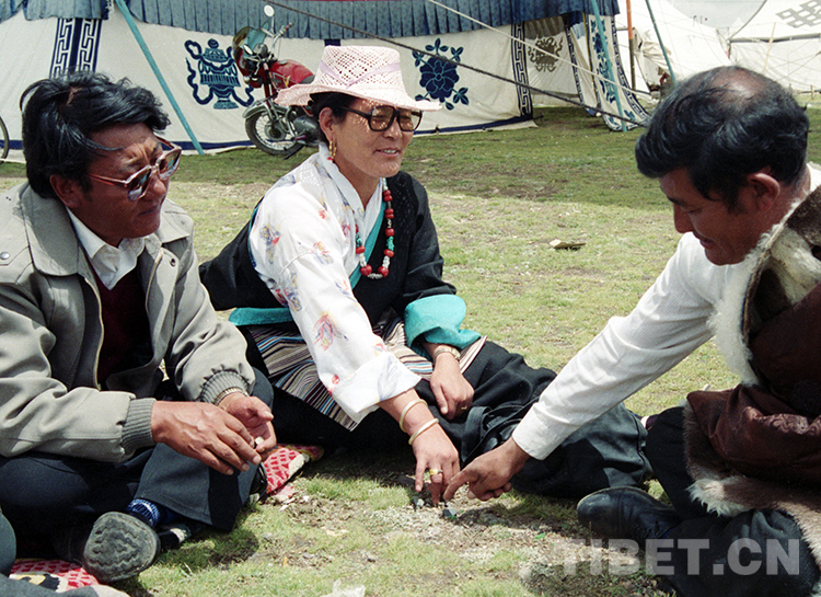 1987年盛夏,時(shí)任那曲地區(qū)(現(xiàn)那曲市)行署副專員的次仁玉珍(中)在那曲賽馬會(huì)的帳篷前,席地而坐與那曲地區(qū)行署專員土登才旺(左)、那曲地區(qū)文化局局長阿布(右)在交流(唐召明1987年攝)