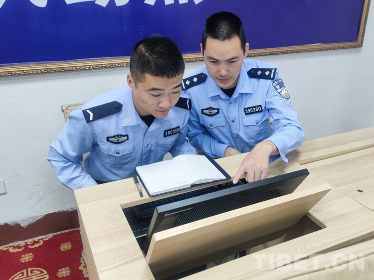 圖為劉華強(右)正在指導新警李東洪進行邊檢業(yè)務學習 攝影:尼瑪云丹