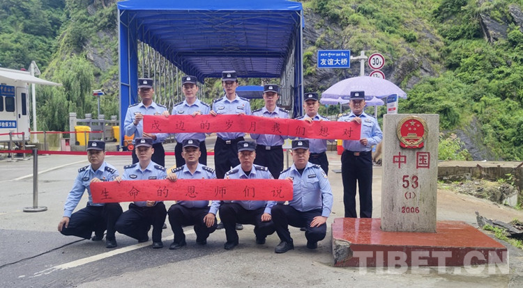 圖為友誼橋執(zhí)勤點全體民警在界碑前對自己的恩師“表白” 攝影:尼瑪云丹