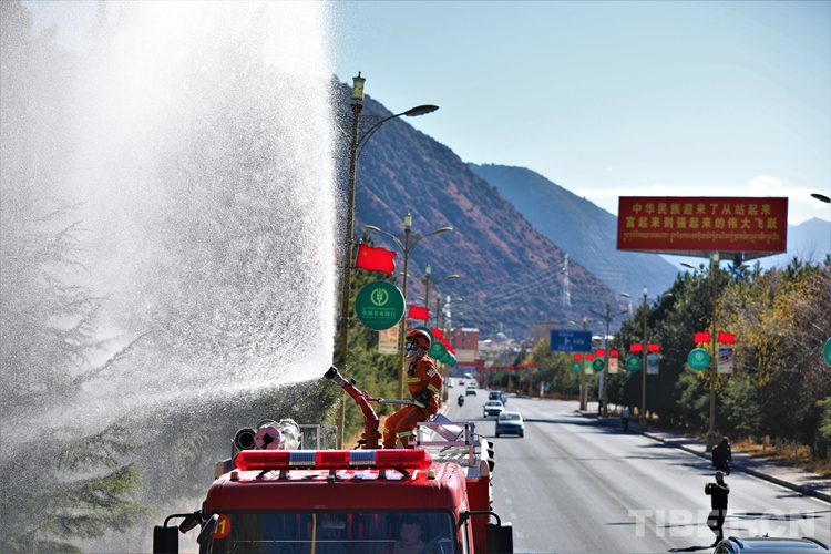 圖為巴宜區(qū)中隊指戰(zhàn)員運用消防車對道路沿線雜草、枯樹進行灑水增濕作業(yè),有效降低重點區(qū)域、道路周邊的火災風險