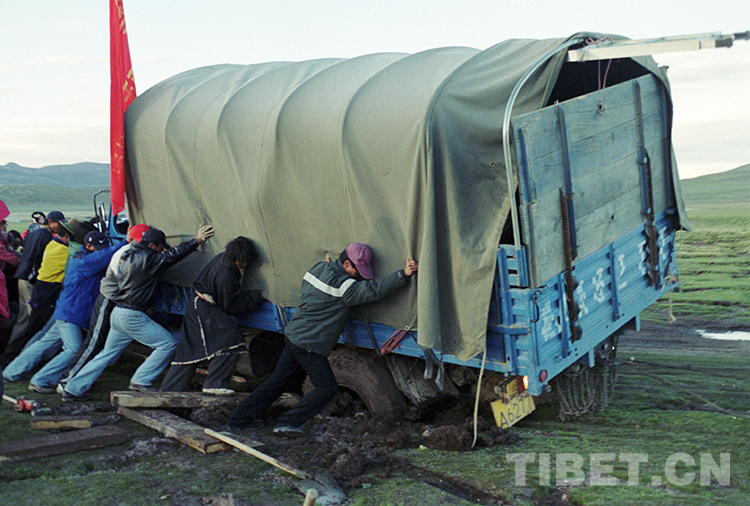 這是科考人員在奮力推出陷進(jìn)藏北無(wú)人區(qū)沼澤地帶的科考卡車(唐召明2001年攝)
