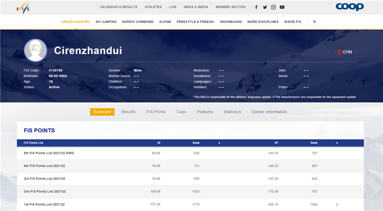 圖為國際雪聯(lián)官網(wǎng)運(yùn)動員次仁占堆介紹