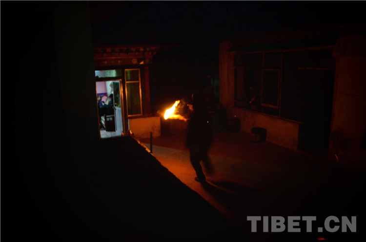 酒足飯飽后,“驅(qū)鬼”儀式開(kāi)始。家人們一起各自用糌粑從頭到腳觸碰一遍、捏下手印后,與故意吃剩的一點(diǎn)古突扔進(jìn)驅(qū)鬼盤(pán),寓意將身心中的病痛與不詳全部拋掉。隨后查斯點(diǎn)燃火把,一邊喊著“所有妖魔都出去”,一邊手持火把跑往所有屋子各掃幾下,拿著火把和驅(qū)鬼盤(pán)到交叉路口焚燒掉。一路狂奔,且不能回頭。