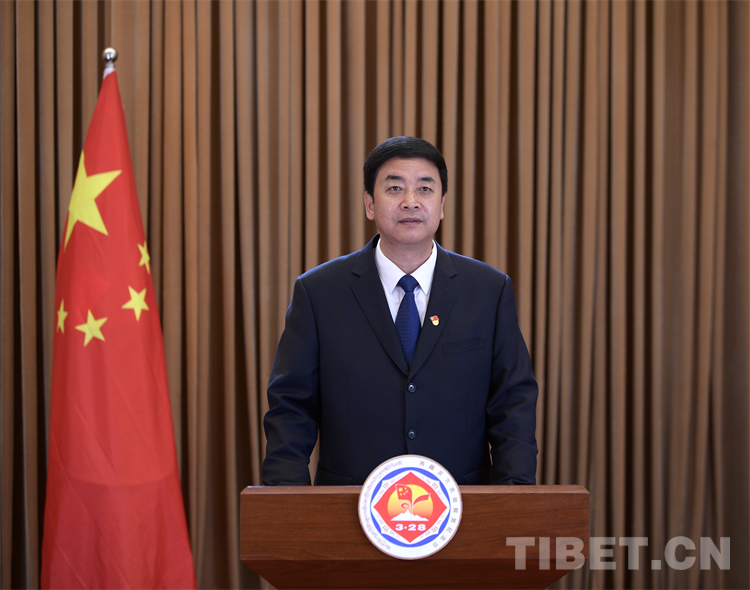 圖為西藏自治區(qū)主席嚴(yán)金海發(fā)表電視講話紀(jì)念百萬農(nóng)奴解放63周年 西藏自治區(qū)黨委宣傳部供圖