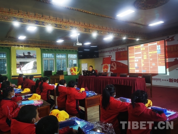 圖為西藏林芝金東邊境派出所民警在朗縣國門講習(xí)所為當(dāng)?shù)匦W(xué)生們帶來愛國主義小課堂 攝影:徐華升
