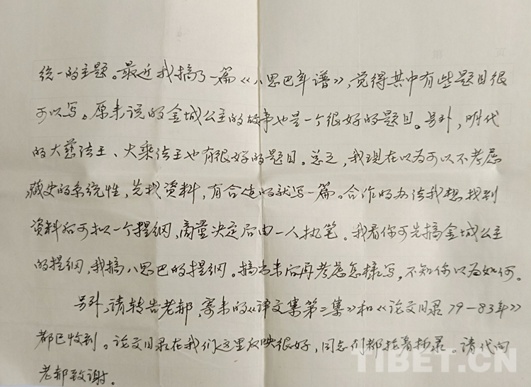 記得我大學畢業(yè)剛到新單位,人生地不熟,加之原來沉浸在“文學夢”中,現(xiàn)在陡然轉(zhuǎn)到藏族歷史研究,所謂基礎(chǔ)不牢地動山搖,困惑加不適,可想而知。陳老師在聊天中得知我的情況后,談到文史不分家,自己對文學也很有興趣,與青?!跺3薄肪庉嫼苁煜?。這樣,我遇到一個學識淵博的良師益友,聆聽指教,何其難得。在陳老師的鼓勵和幫助下,我在惶惑中嘗試把歷史與文學結(jié)合起來,與他合作發(fā)表了歷史故事新編《長安和親》《香波山奇遇—吐蕃聶墀贊普的故事》等,平穩(wěn)地完成了專業(yè)變動的過渡期。后來,他離開中央民族學院到青海社會科學院工作,我們之間仍堅持信件往來,得到他很多幫助。每一次通信,我們談得最多的都是學術(shù)。在某次回信中,他談及下一步合作的工作,特別提到“至于今后如何搞,我想原來定的歷史故事新編計劃似乎是太大了一點。主要從藏族史的系統(tǒng)性考慮,而沒有考慮到現(xiàn)實的需要。所以我想還是先寫主題符合現(xiàn)實需要的題目,寫歌頌民族團結(jié)、文化交流,國家統(tǒng)一的主題。最近,我搞了一篇《八思巴年譜》,覺得其中有些題目很可以寫。原來說的金城公主的故事也是一個很好的題目。另外,明代的大慈法王、大乘法王也有很好的題目??傊?,我現(xiàn)在認為可以不考慮藏族史的系統(tǒng)性,先找資料,有合適的就寫一篇。合作的辦法我想找到資料后,可擬一個提綱,商量決定后,由一人執(zhí)筆。我看你可先搞金城公主的提綱,我搞八思巴的提綱,搞出來后再考慮怎樣寫,不知你以為如何?!?/p>
