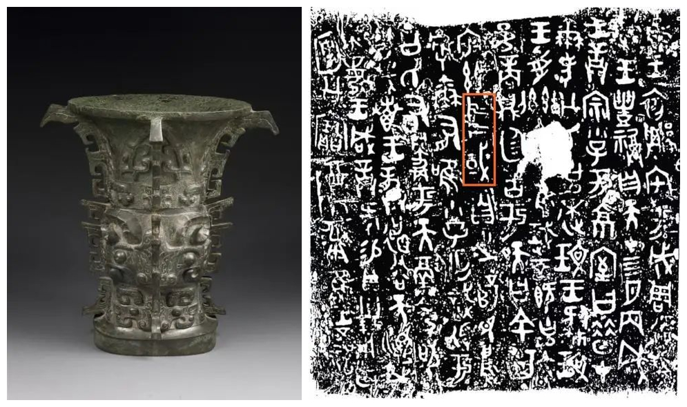 圖左為出土于陜西寶雞的西周早期青銅器、中國(guó)首批禁止出國(guó)(境)展覽文物、國(guó)家一級(jí)文物——何尊;圖右為何尊內(nèi)底鑄銘文“中國(guó)”一詞。這是“中國(guó)”一詞最早的出土見證。 圖片來源:寶雞青銅器博物院