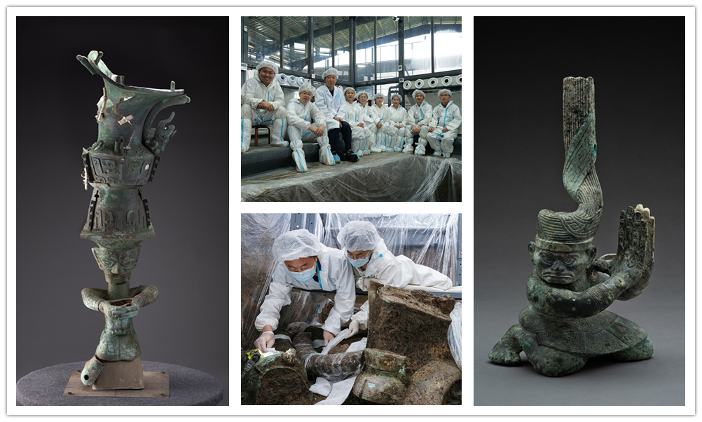 圖左為三星堆遺址三號(hào)坑出土銅頂尊跪坐人像;圖中上為部分發(fā)掘人員合影;圖中下為象牙保護(hù)與提?。粓D右為三星堆遺址四號(hào)坑出土扭頭跪坐銅人像 圖片來源:國(guó)家文物局