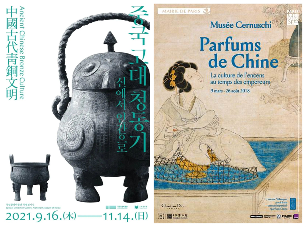 圖左為2021年9月,上海博物館在韓國(guó)國(guó)立中央博物館舉辦“中國(guó)古代青銅文明”特展海報(bào);圖右為2018年上海博物館在法國(guó)巴黎舉辦的“中國(guó)芳香:古代中國(guó)的香文化”展覽海報(bào) 圖片來源:上海博物館