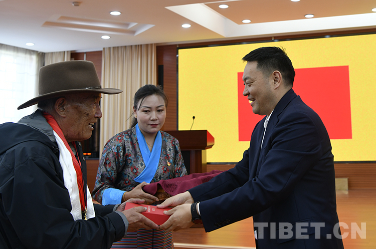 圖為西藏自治區(qū)黨委常委、統(tǒng)戰(zhàn)部部長,自治區(qū)政協(xié)黨組副書記、副主席嘎瑪澤登向“光榮在黨50年”的老黨員頓珠多吉頒發(fā)紀念章 攝影:王媛媛