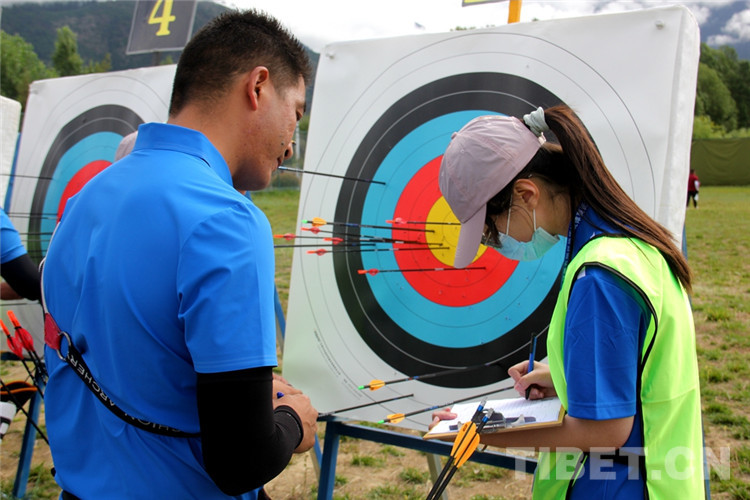 圖為7月29日,一名選手在男子個(gè)人70米雙輪賽現(xiàn)場(chǎng)標(biāo)記箭孔 攝影:德吉卓嘎