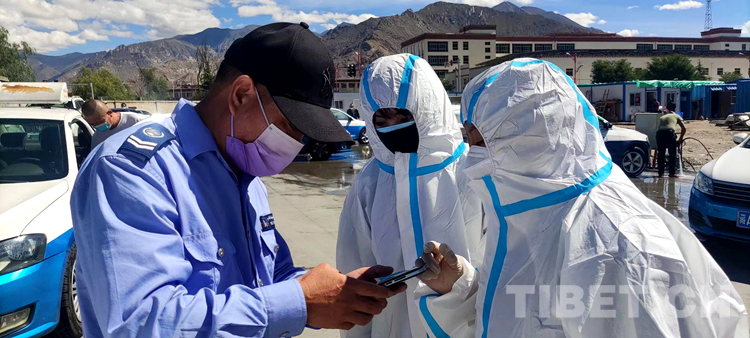 圖為在拉薩貢布堂路出租車洗車消毒點(diǎn),出租車駕駛員和兩位防疫志愿者交流核酸檢測結(jié)果查詢 攝影:趙良發(fā)