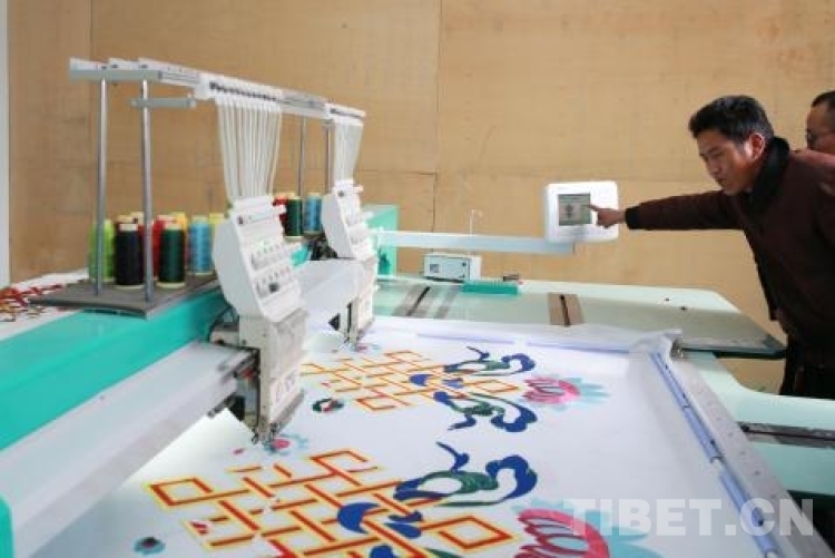 洛隆縣博織利民服飾有限公司老總向巴操作電子刺繡機(jī)刺繡帳篷上的圖案。陳衛(wèi)國攝