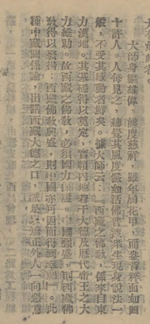 次年,應重慶漢藏教理院和成都佛學社的邀請,東本格西決定前往當?shù)刂v法。期間,日本空襲不斷,拉薩官民與弟子因憂慮東本格西安危,力勸其勿前往。但是,東本格西從佛教利益世間的角度出發(fā),認為在當?shù)孛癖娍嚯y之際,作為僧人更應不懼危險,前往當?shù)匚拷迕癖姡约偨鈶?zhàn)爭造成的創(chuàng)傷與苦痛。1943年1月,東本格西從拉薩啟程前往理化(今理塘),參加九世班禪靈童尋訪測驗事宜。4月,經(jīng)由康定抵達成都,沿途受到各地政府官員與僧俗弟子的歡迎。東本格西應中國邊疆問題研究會邀請講演“佛教與邊疆”,蒙藏委員會委員格桑澤仁翻譯。[3]講演內(nèi)容主要分為三部分:首先,詳細敘述藏傳佛教發(fā)展演變的歷史,提出因于歷代高僧與中央政府的大力維護與資助,藏傳佛教發(fā)展的基礎才得以奠定;其次,分析邊疆佛教的分布與信仰狀況;最后,分析佛教與邊疆的關系。[4]他在講到佛教昌盛與國家實力發(fā)展之間的關系時,明確提出“西藏之佛教,必須國力保護,中國強盛,則藏傳佛教得以發(fā)揚,藏傳佛教興盛,則中國亦可因而得到幸?!盵5]。東本格西從歷史和現(xiàn)實角度詮釋西藏作為中華民族共同家園的角色,邊疆不惟具體的地理概念和信仰文化差異的標簽,而是中央政府長期支持發(fā)展的歷史凝結(jié),是中華民族共同家園的一分子。