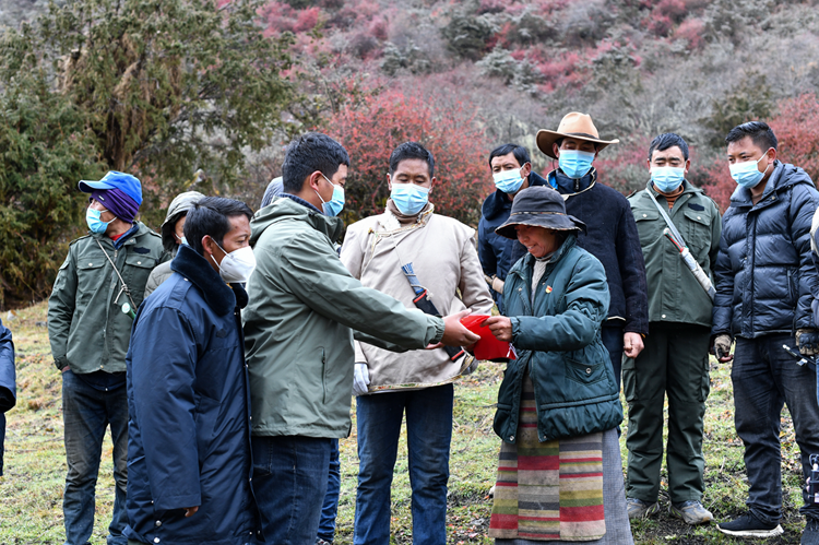 中國西藏網(wǎng)訊 日前,西藏自治區(qū)山南市玉麥鄉(xiāng)玉麥村第一書記索朗頓珠組織護邊員們開始了新一次的巡邏。臨行前,黨的二十大代表、“七一勛章”獲得者卓嘎特意叮囑索朗頓珠巡邏時要注意安全,走到哪里,就要把國旗帶到哪里,并把一面嶄新的國旗交到了索朗頓珠的手里。