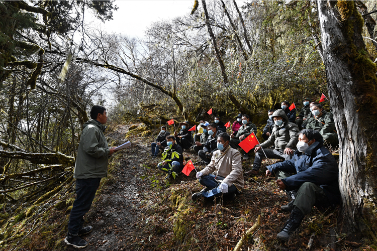 圖為在休息間隙圖索朗頓珠為護邊員宣講黨的二十大精神