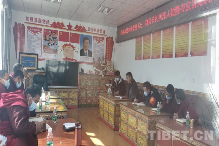 圖為洛扎縣拉隆寺僧人和駐寺干部深入學(xué)習(xí)黨的二十大精神,僧人們表示,要持續(xù)弘揚愛國愛教優(yōu)良傳統(tǒng),自覺踐行“四條標(biāo)準(zhǔn)”,不斷增進(jìn)“五個認(rèn)同”,牢固樹立“三個意識”,堅持藏傳佛教中國化方向,積極推動宗教與社會主義社會相適應(yīng),堅定不移聽黨話、感黨恩、跟黨走。