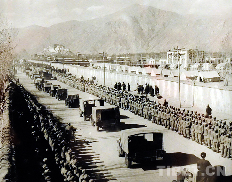1954年12月25日,汽車第一次開(kāi)進(jìn)拉薩。當(dāng)天,青藏、川藏公路正式通車,兩隊(duì)350多輛汽車披紅掛彩會(huì)師布達(dá)拉宮廣場(chǎng)(唐召明翻拍照片)