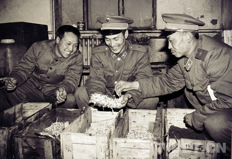 這是青藏公路五道梁兵站官兵在觀看自己新生產(chǎn)出的豆芽。在風(fēng)雪青藏公路線上,它豐富了過(guò)往人員就餐的“菜盤子”(唐召明1987年攝)