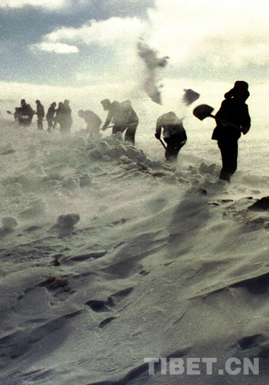 這是109道班工人在風(fēng)雪中鏟雪開(kāi)路,確保青藏公路的暢通(唐召明1990年冬攝)