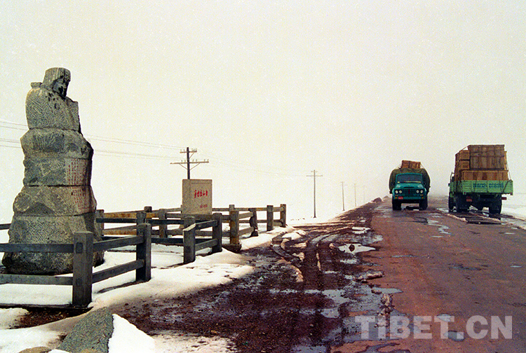 這是汽車正在通過(guò)青藏公路海拔5231米的唐古拉山口(唐召明1996攝)