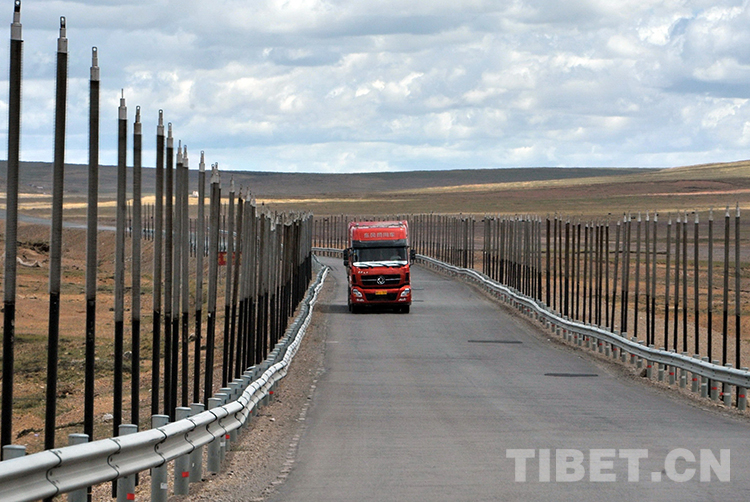 這是一輛卡車正在通過(guò)青藏公路兩邊立有一根根熱棒的凍土路段。熱棒是一種高效熱導(dǎo)裝置,可保持凍土終年不化(唐召明2015年8月12日攝)
