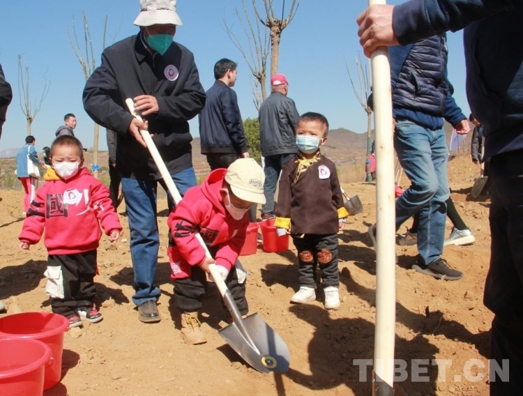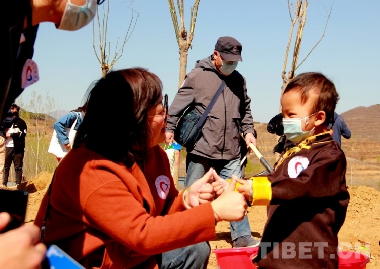 來自青海省果洛藏族自治州的多杰雖然才3歲多,但在掌握了鐵锨的使用后,他就成了整個(gè)植樹區(qū)域的熱心人,到處幫助別人鏟土,樂此不疲。圖為多杰正在幫助別人鏟土植樹 攝影:劉莉