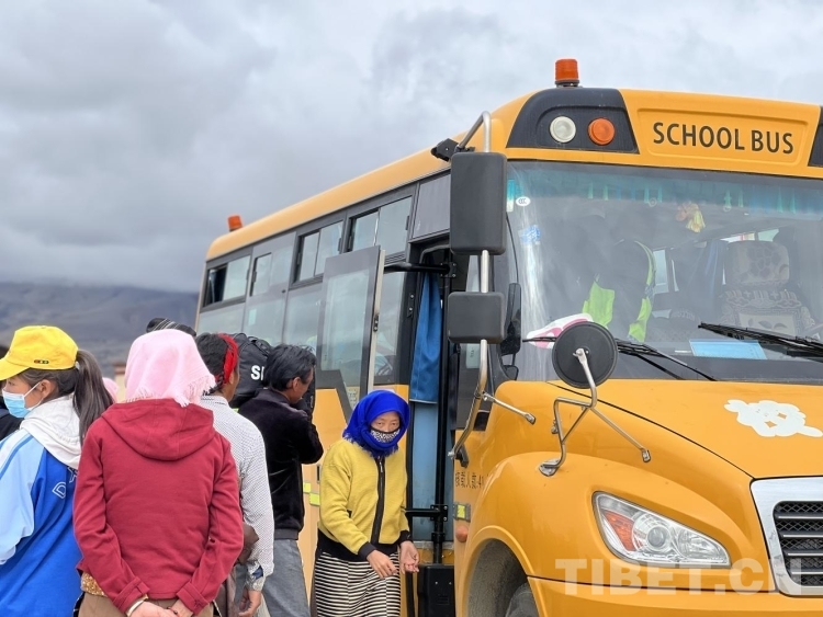上午十一點,穿著牧區(qū)藏袍、頭戴淺色頭巾的婦女和紅色“扎秀”(辮尾)的男士背起牛羊毛編織的背包,牽著自家小孩的手紛紛到達集合點?!靶\噥砝?!”學生們在村委會院子里自覺排起了隊。