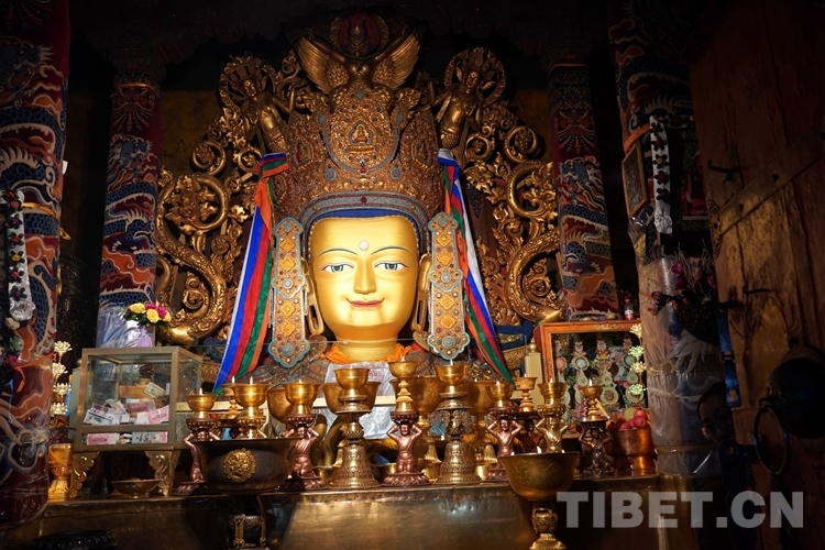 上午9時(shí),在僧眾的期盼中,班禪抵達(dá)哲蚌寺。頓時(shí),鑼鼓喧天,法螺、法號(hào)齊鳴。在手持香爐的高僧以及吹嗩吶的僧人引路,手持黃傘的高僧護(hù)送下,班禪緩步走進(jìn)措欽大殿,逐一朝拜寺內(nèi)各殿堂,并向主供佛像敬獻(xiàn)哈達(dá)。期間,班禪還前往甘珠爾拉康參訪,這里藏有多部《甘珠爾》大藏經(jīng)。
