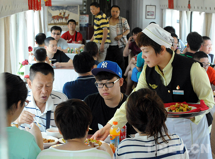 北京鐵路局北京客運(yùn)段京藏車隊(duì)副隊(duì)長(zhǎng)彭海燕在北京開往拉薩的餐車上為就餐旅客服務(wù)(唐召明2014年7月5日攝)