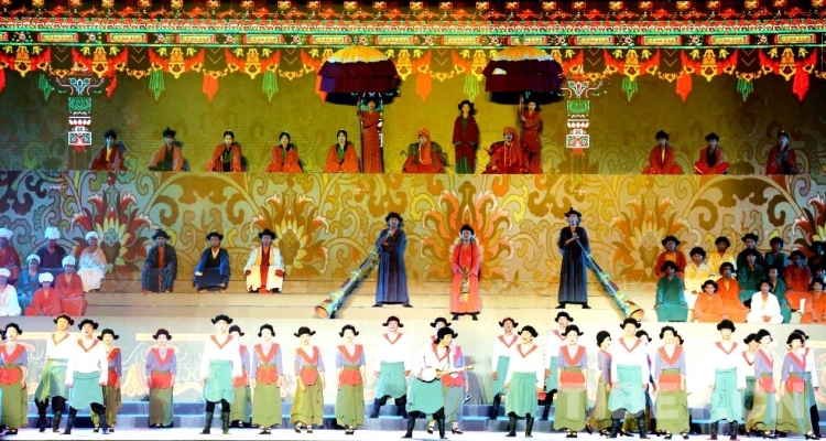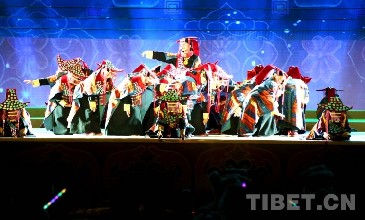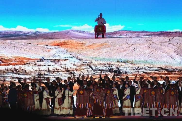 隨后盛大的開(kāi)幕式文藝演出如期而至。演出共分為《悠遠(yuǎn)古韻》《詩(shī)意微芒》《如炬經(jīng)典》《輝煌盛世》四個(gè)篇章。《悠遠(yuǎn)古韻》篇章為大型情景表演,結(jié)合古格壁畫(huà)為開(kāi)場(chǎng)表演,展現(xiàn)出阿里人民群眾的精神面貌和獨(dú)特的阿里神韻?!对?shī)意微芒》匯集阿里地區(qū)諸多極具代表性的國(guó)家級(jí)非物質(zhì)文化遺產(chǎn)節(jié)目,展現(xiàn)阿里地區(qū)悠久燦爛的古代文明遺存?!度缇娼?jīng)典》篇章通過(guò)不同舞蹈,展現(xiàn)阿里獨(dú)具特色的民間歌舞文化?!妒⑹老腋琛穭t展現(xiàn)了阿里地區(qū)以熱情昂揚(yáng)的姿態(tài)在全力以赴推動(dòng)建設(shè)雪域高原“西部明珠”中取得的一系列可喜的成績(jī)。