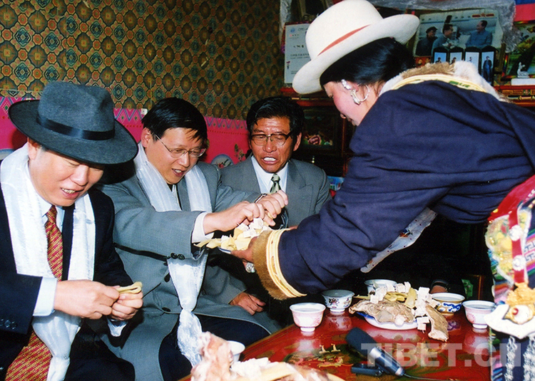 時(shí)任農(nóng)業(yè)部副部長范小建(左二)在隨慶祝西藏自治區(qū)和平解放五十周年代表團(tuán)再次回到西藏時(shí),與代表團(tuán)其他成員一同在藏族群眾家中做客,了解生產(chǎn)和生活情況(范小建提供照片,2001年9月攝)