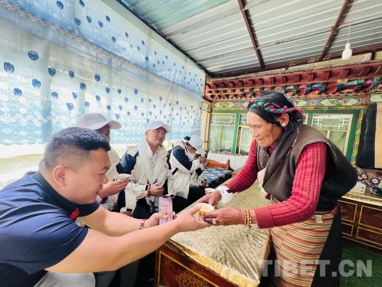 圖為慰問困難家庭時(shí)阿媽次仁為愛心志愿者到酥油茶 攝影:德吉卓瑪