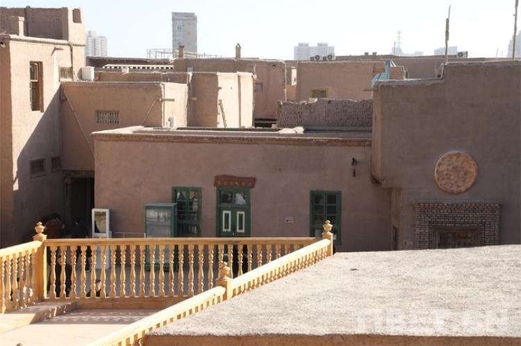 中國西藏網(wǎng)訊 在中國新疆維吾爾自治區(qū)喀什市,在繁榮熱鬧的喀什古城對面,僅一條馬路之隔,坐落著代表喀什傳統(tǒng)建筑靈魂的高臺(tái)民居。高臺(tái)民居又名闊孜其亞貝希老城區(qū),它位于吐曼河西岸一處高約30米、長寬約400米的黃土高臺(tái)上,其面積約57000平方米。“闊孜其亞貝?!庇懈哐峦撂盏囊馑?,因而高臺(tái)民居又被稱為高崖上的土陶人家。