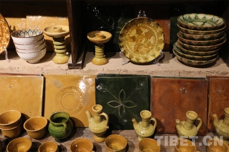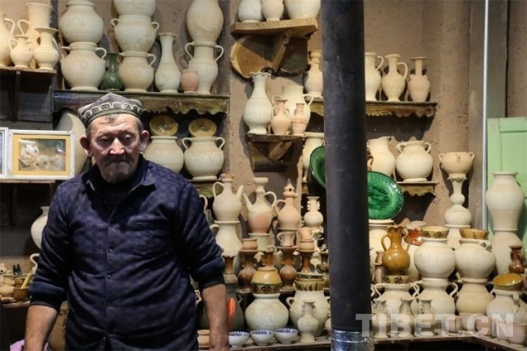深入高臺(tái)民居的內(nèi)部,就可以找尋到現(xiàn)存的土陶人家。步入這個(gè)安靜的小院,各式各樣的土陶制品立馬映入眼簾。土陶人家的店主吐爾遜·肉斯塔木是國家級(jí)非物質(zhì)文化“模制法土陶燒制技藝”的第七代傳承人,他從17歲開始獨(dú)立工作,如今68歲的他依舊挽起袖管,非常投入地沉浸在土陶工藝的創(chuàng)作世界里。