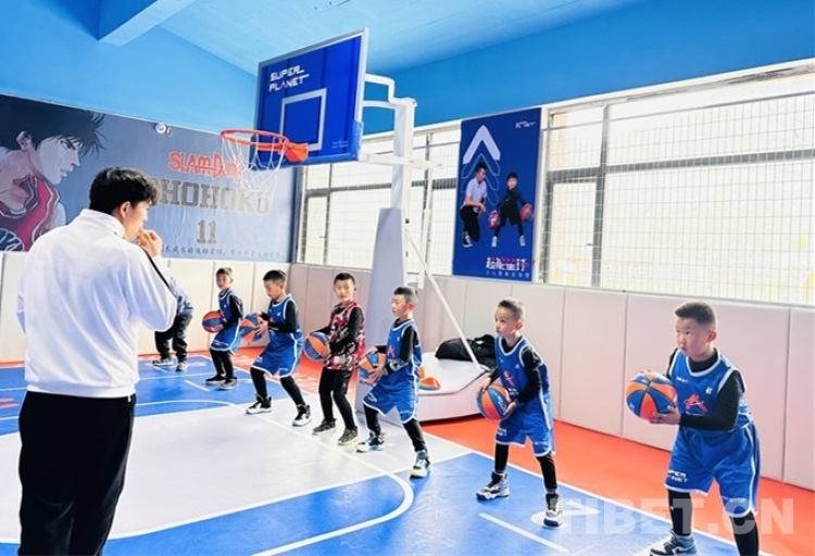 圖為籃球培訓課上,身穿籃球服的小朋友在認真聽課