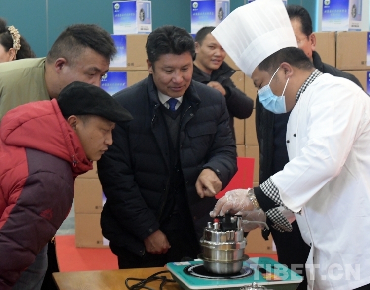 那曲市委常委、常務(wù)副市長(zhǎng)白瑪羅布(中)在捐贈(zèng)活動(dòng)現(xiàn)場(chǎng),觀看高原節(jié)能鍋的使用演示(唐召明2023年12月26日攝)