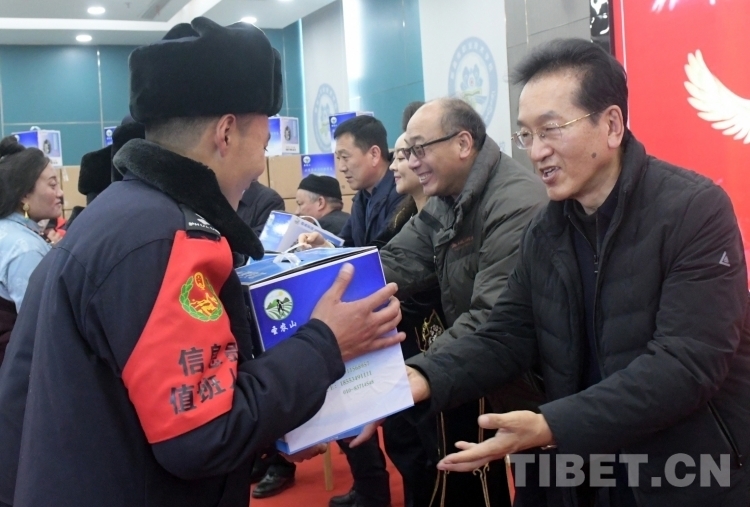 西藏自治區(qū)政協(xié)原副主席、北京建藏援藏工作者協(xié)會(huì)副會(huì)長(zhǎng)阿沛·晉源在向受贈(zèng)群眾發(fā)放高原節(jié)能鍋(王博軒2023年12月26日攝)