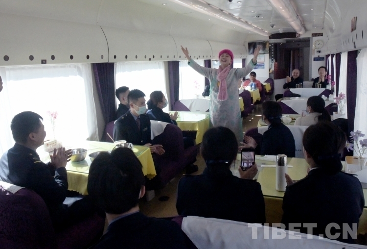 首次進(jìn)藏的著名歌唱家、協(xié)會(huì)公益愛心大使黃春燕在從拉薩到那曲的列車上為“天路”列車員演唱膾炙人口的《天路》之歌(唐召明2023年12月25日攝)