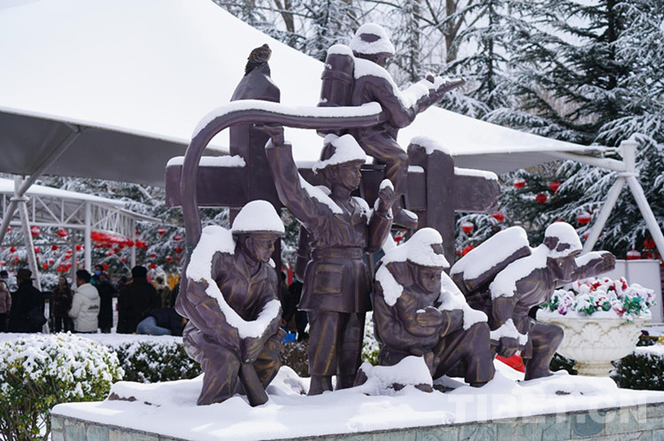 第二站,銅牛廣場。銅牛廣場位于布達拉宮西南方向約300米處,北京中路與林廓西路在此相交。這里是開放式的人行道,非常開闊,是通往布達拉宮廣場的必經(jīng)之路,很多人都在此合影留念。雪中的銅牛披上了白色的“外衣”,更加體現(xiàn)出“憨厚、忠誠、悲憫、堅韌、勇悍、盡命”的牦牛精神。