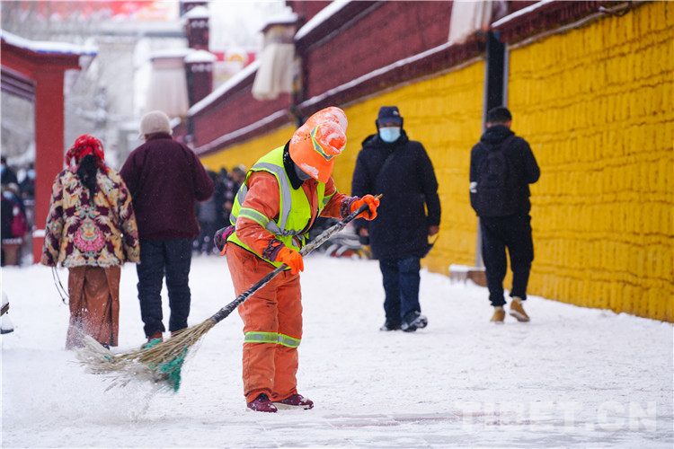 圖為功德林寺前掃除積雪的“城市美容師” 攝影:趙振宇