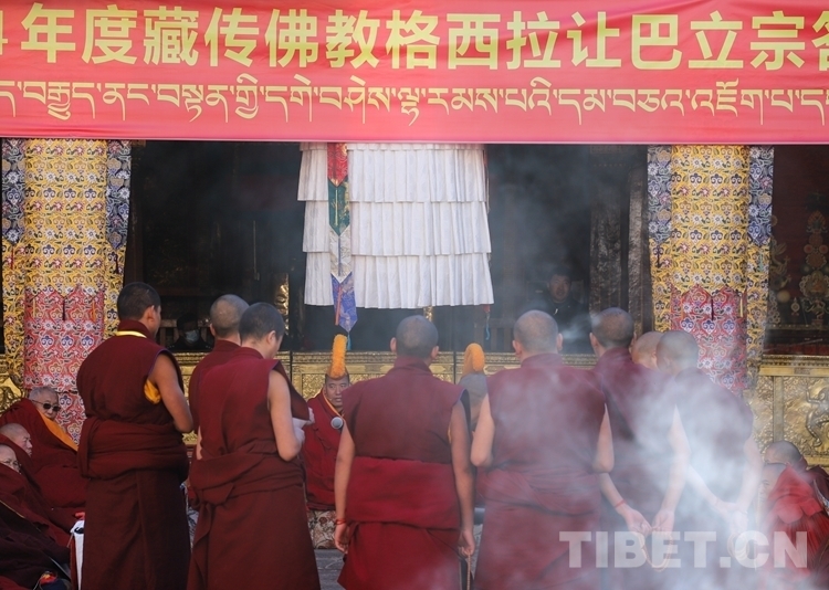 當(dāng)日上午9時(shí),立宗答辯儀式正式開始,儀式由藏傳佛教學(xué)經(jīng)僧人考取格西拉讓巴學(xué)位考評(píng)委員會(huì)主持。按照傳統(tǒng)慣例,先舉行無(wú)齋佛事活動(dòng),在考評(píng)委員會(huì)的監(jiān)考下,應(yīng)考格西拉讓巴學(xué)位的12名考僧輪流答辯陪考僧眾所提有關(guān)《釋量論》《般若學(xué)》《中觀學(xué)》《俱舍論》《戒學(xué)》五部經(jīng)典方面的內(nèi)容。立宗答辯儀式結(jié)束后,所有參加答辯儀式的僧人集體誦經(jīng)祈禱,同時(shí)供齋茶齋飯。齋后,由西藏自治區(qū)宗教局負(fù)責(zé)人代表西藏自治區(qū)政府向參加答辯活動(dòng)的僧人發(fā)放布施。