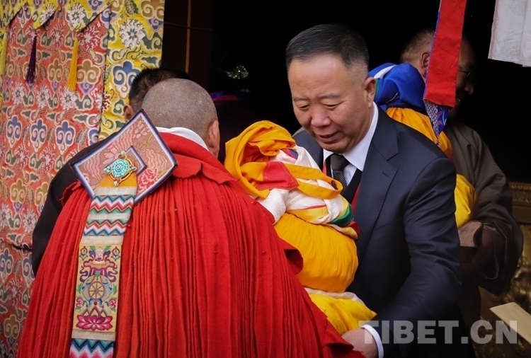 圖為西藏自治區(qū)政府副秘書長(zhǎng)高寶軍向獲得學(xué)位的考僧贈(zèng)送五彩緞、干果、袈裟 攝影:賈華加