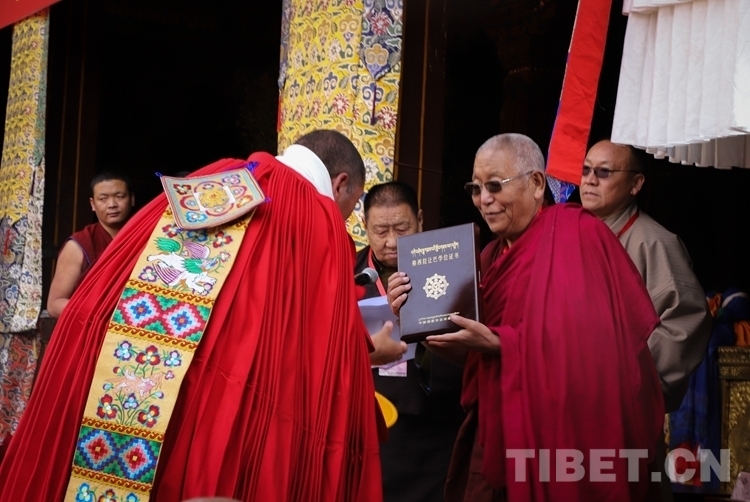 圖為佛協(xié)西藏分會(huì)副會(huì)長(zhǎng)、扎什倫布寺堪布噶欽?多吉堅(jiān)贊向獲得學(xué)位的考僧獻(xiàn)哈達(dá)并頒發(fā)學(xué)位證書 攝影:賈華加