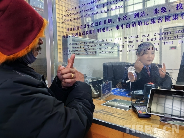 圖為李欣怡在拉薩火車站售票窗口用手語與旅客溝通