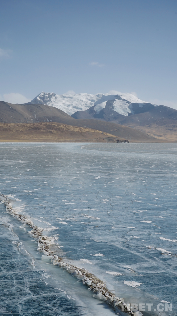 又見羊卓雍措是在冬日。與夏天不同,冬天的西藏常見大風(fēng)。云一少,羊湖的藍(lán)愈加冷冽深邃。在去普瑪江塘鄉(xiāng)采訪的途中,還路過了普莫雍錯(cuò)。與全年幾乎不結(jié)冰的羊湖不同,普莫雍錯(cuò)已經(jīng)結(jié)為通透的藍(lán)冰。湖的邊緣像是在打浪的一瞬間凍結(jié)起來的,一層一層,走在上面稍不留神就會(huì)被湖面的大風(fēng)吹倒。