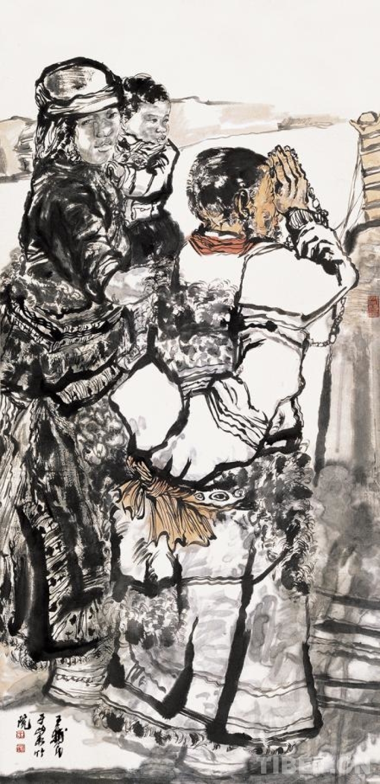 “真正深入當(dāng)?shù)厝ンw驗(yàn)藏族群眾的生活,創(chuàng)作出來的作品才會(huì)真實(shí)感人?!蓖踺o民在談到藏族題材的創(chuàng)作感悟時(shí)說,“青藏高原最吸引人的地方是生活在這里的人們飽滿的精神狀態(tài)。我們要敬畏自然,尊重文化,保持充滿感情、充滿崇敬之情的創(chuàng)作情感和態(tài)度,用中國(guó)畫的水墨形式去表現(xiàn)藏族群眾的生活,去表現(xiàn)雪域的蒼茫與藏族群眾頑強(qiáng)不屈的性格,表現(xiàn)人與自然的關(guān)系?!?/p>